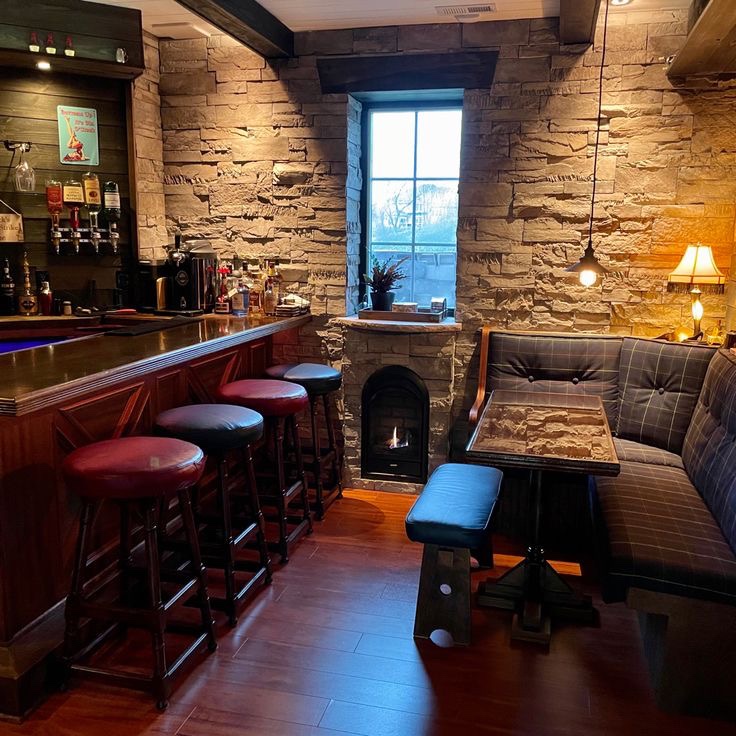 • Seating: Opt for cozy leather or upholstered seats. High-top tables and traditional barstools create an authentic feel.